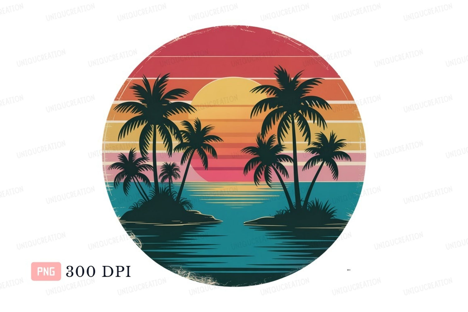 Vintage Retro Ocean Colorful Water Sunset Tropical Island Palms Sky