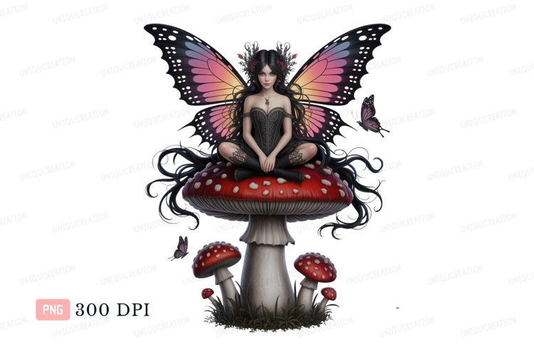 Black haired fairy on red mushroom butterfly fantasy example image 1