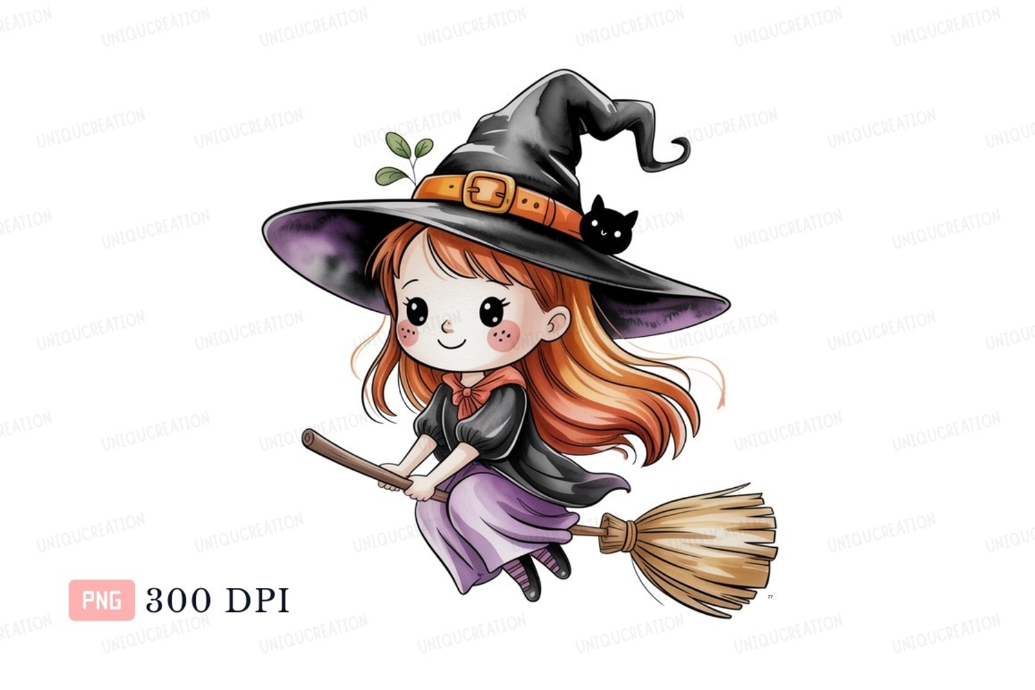 Halloween Black Cute Girl Clipart Witch Purple Orange Flying Broomstick