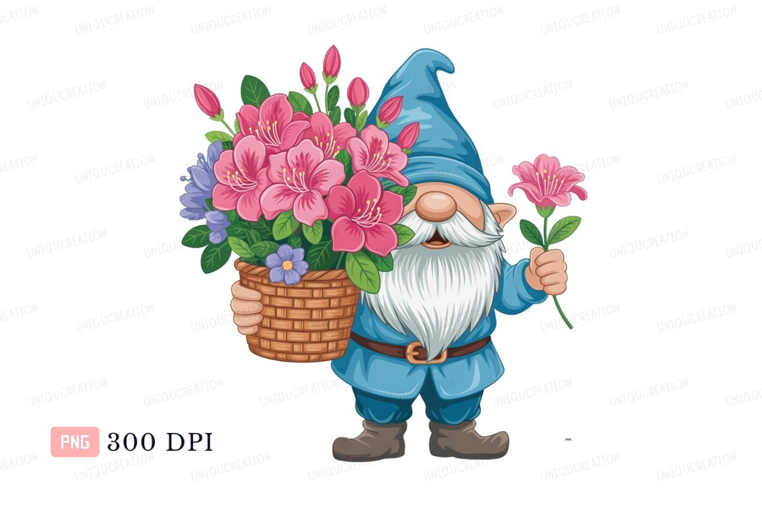 Blue gnome holding pink flowers basket example image 1