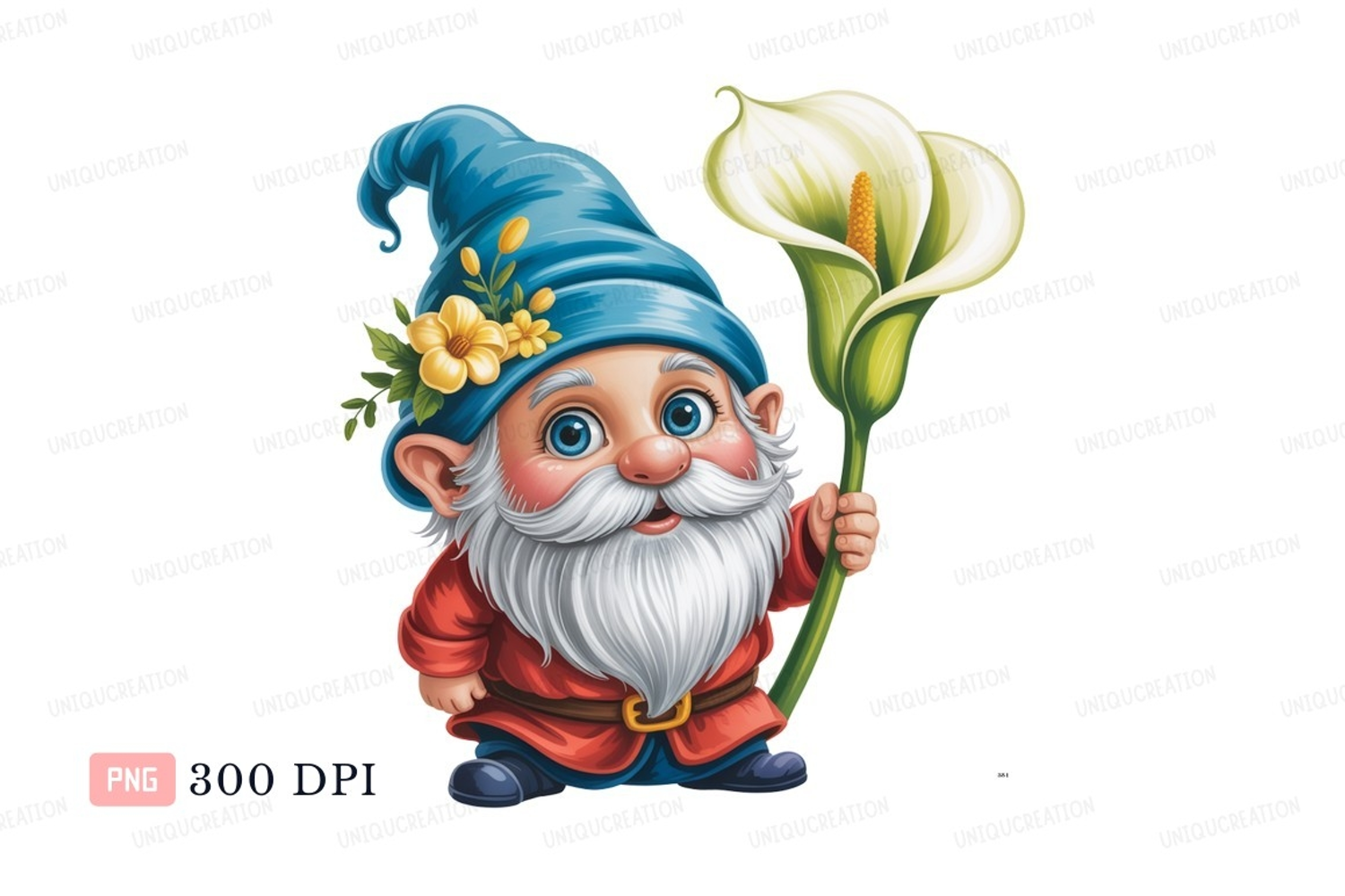 Cheerful gnome holding white calla lily fantasy character example image 1
