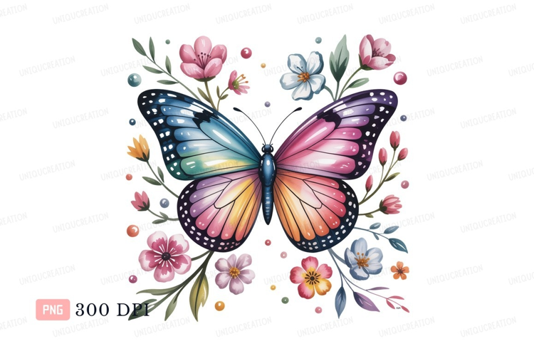 Colorful butterfly surrounded by flowers pink blue example image 1