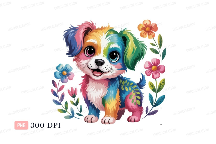 Cartoon Playful Cute Colorful Floral Flowers Clipart Puppy Rainbow Dog