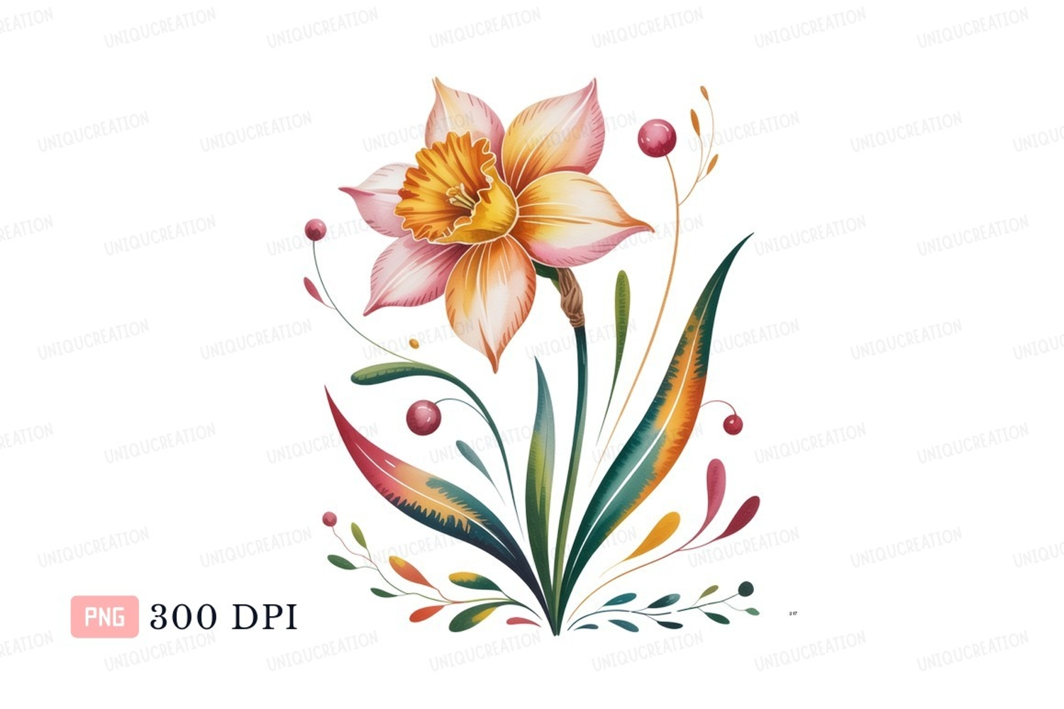 Illustration Pink Green Flower Leaves Botanical Orange Yellow Berries Daffodil