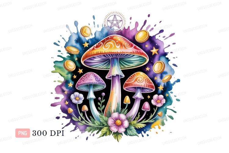 Watercolor Fantasy Whimsical Flowers Magic Vibrant Mushrooms Stars Coins Psychedelic