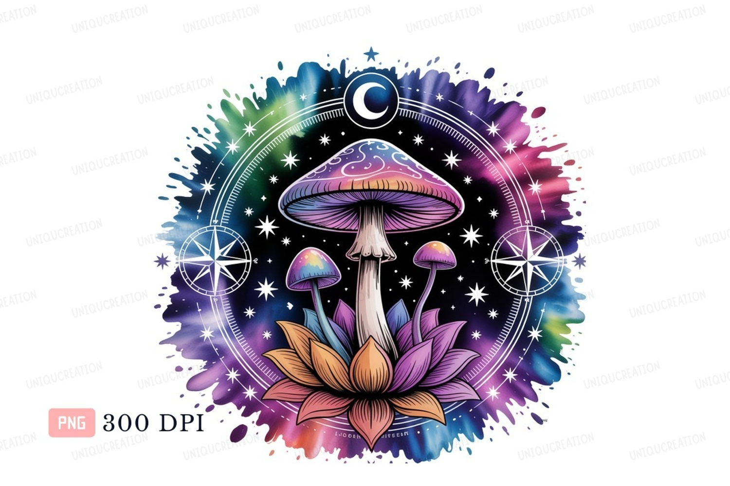 Fantasy Celestial Magic Cosmic Mushroom Moon Lotus Compass Stars Psychedelic