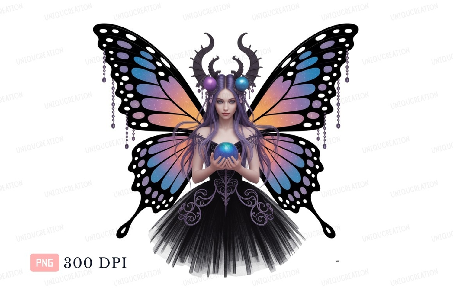 Fantasy Black Fairy Dress Purple Orange Blue Butterfly Wings Orb