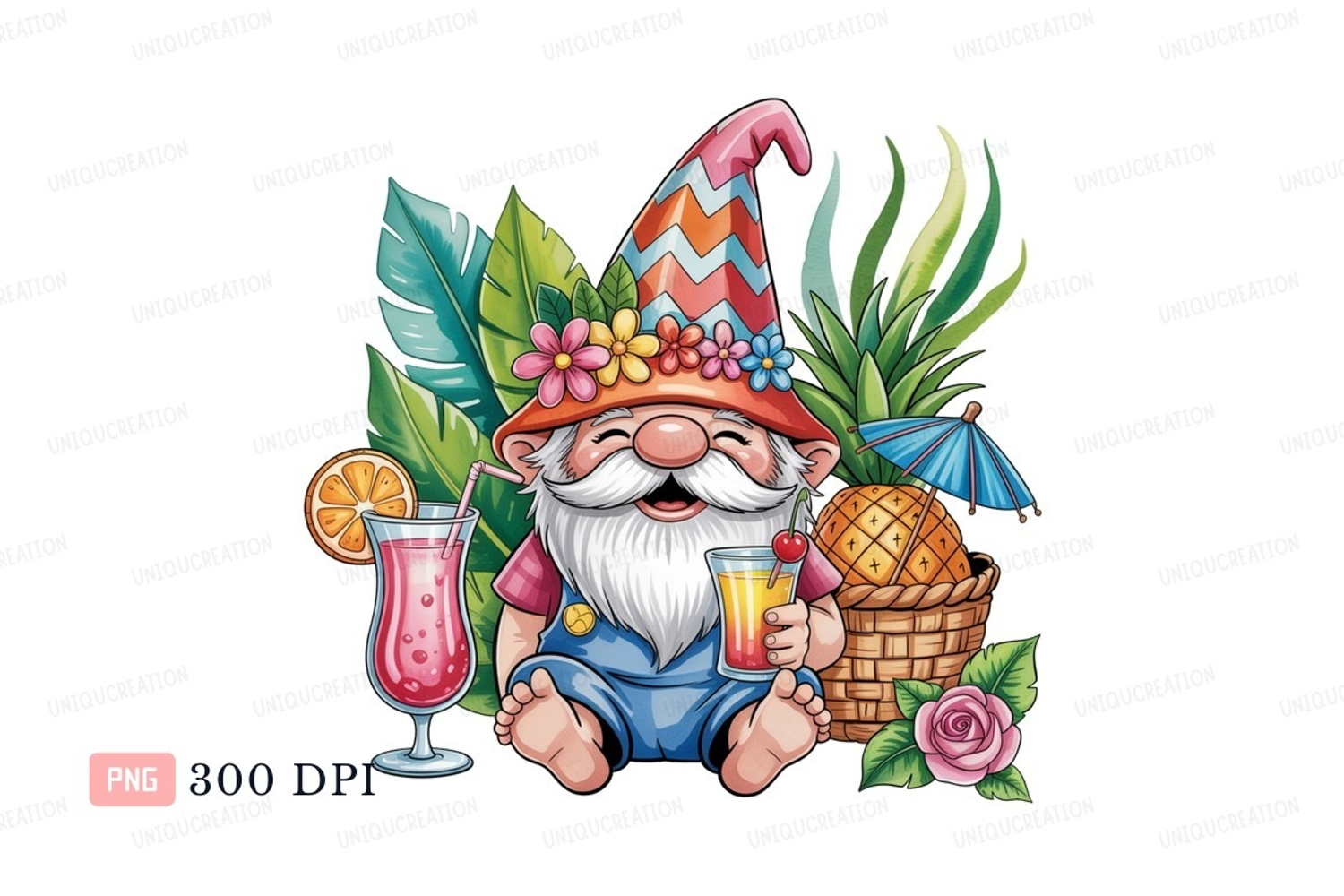 Cheerful gnome enjoying tropical drinks pineapple flowers example image 1