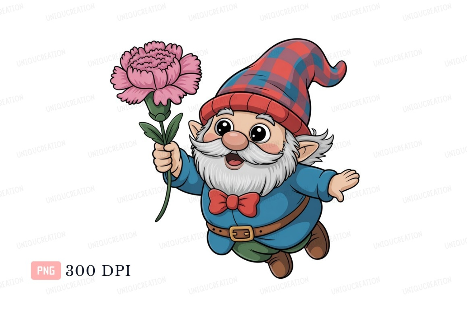 Similar Design Products to Cheerful gnome holding pink flower blue