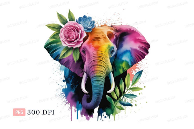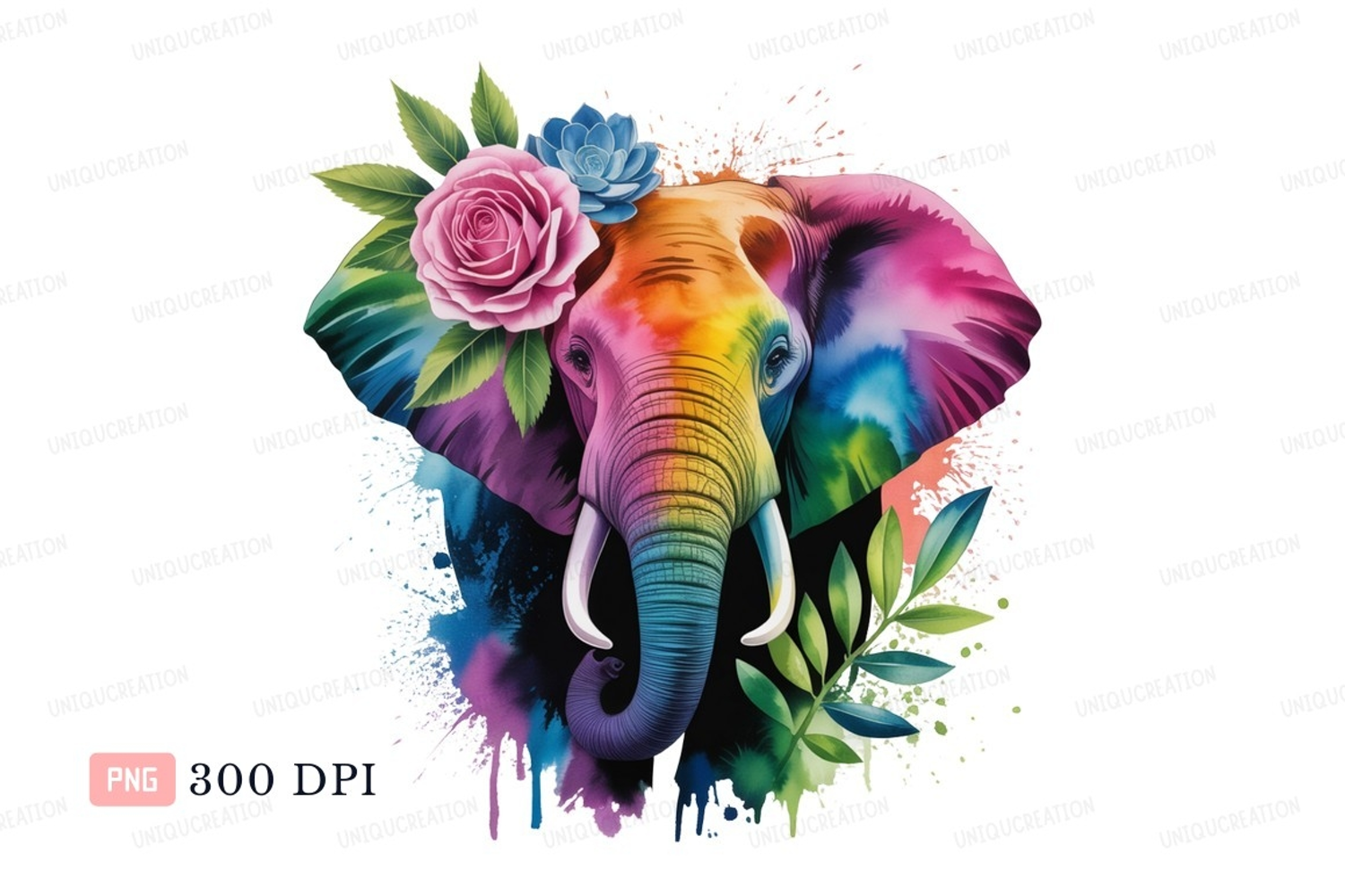 Watercolor Pink Green Flowers Splash Leaves Blue Vibrant Elephant Rainbow