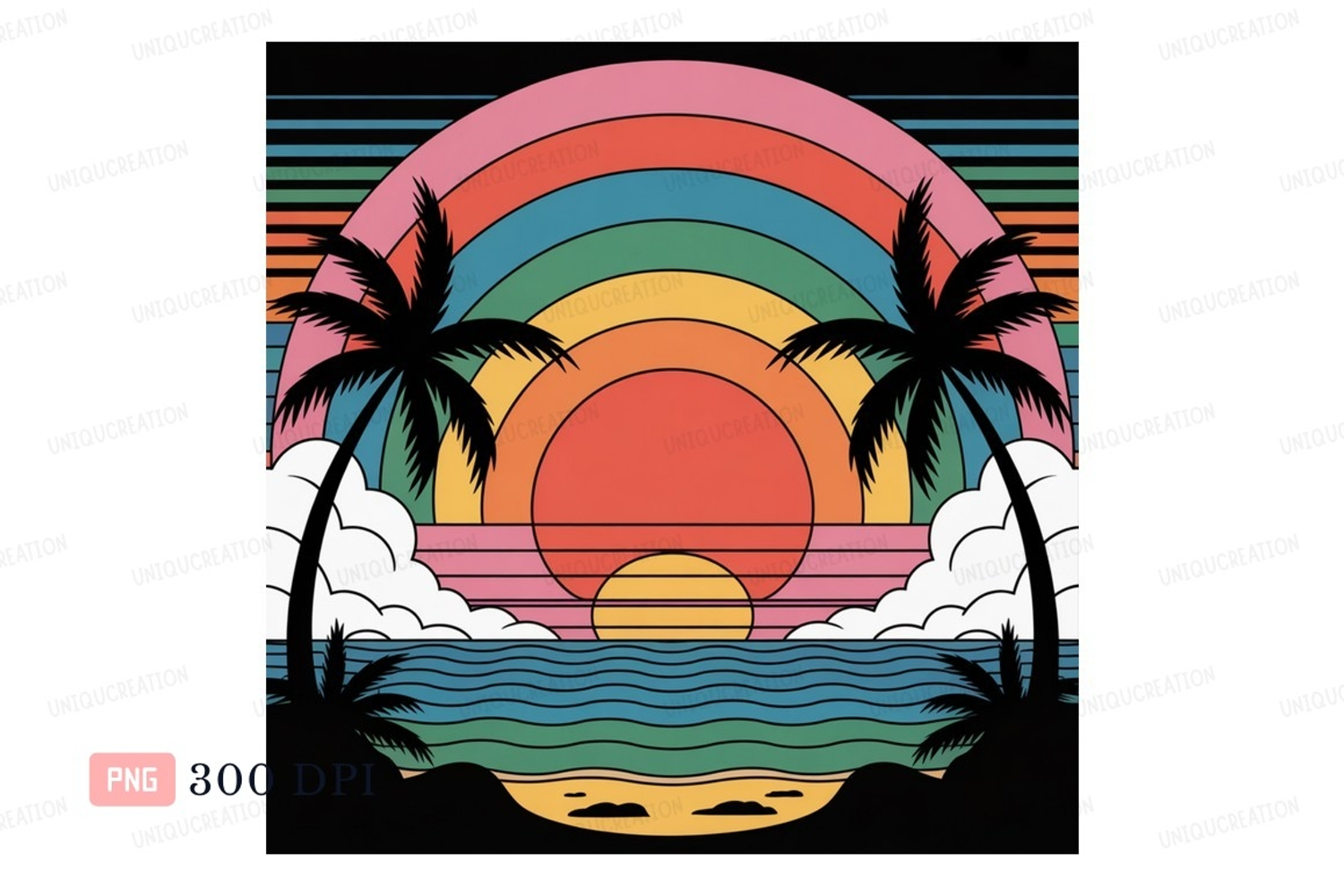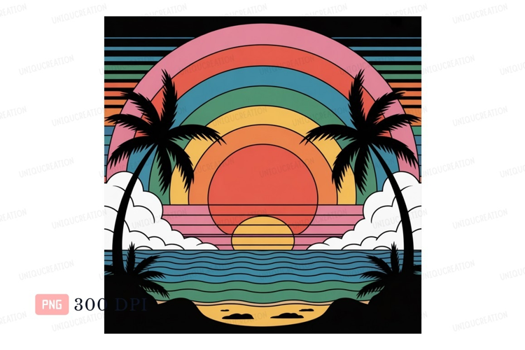 Retro Ocean Colorful Beach Sunset Vibrant Trees Rainbow Clouds Palm