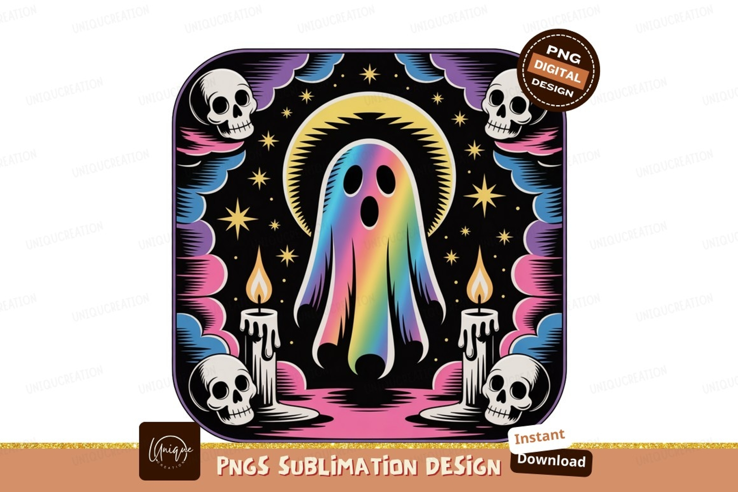 Colorful ghost surrounded by skulls and candles rainbow