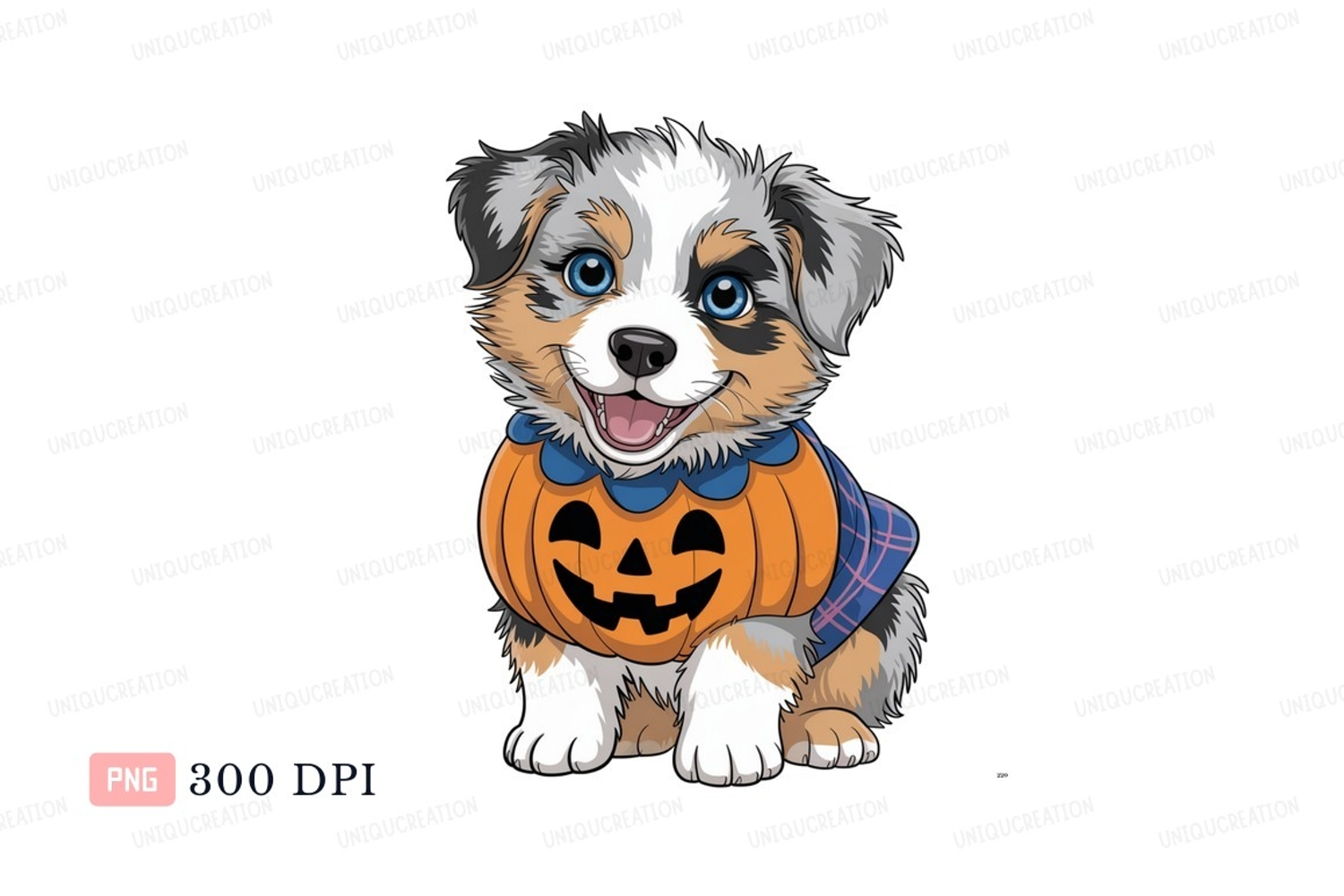 Adorable puppy wearing pumpkin costume australian shepherd example image 1