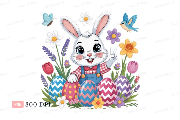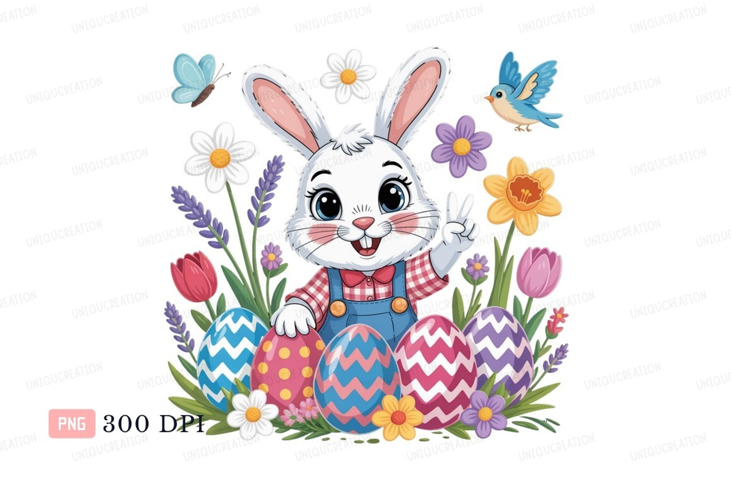 Cheerful bunny with painted eggs and flowers easter example image 1