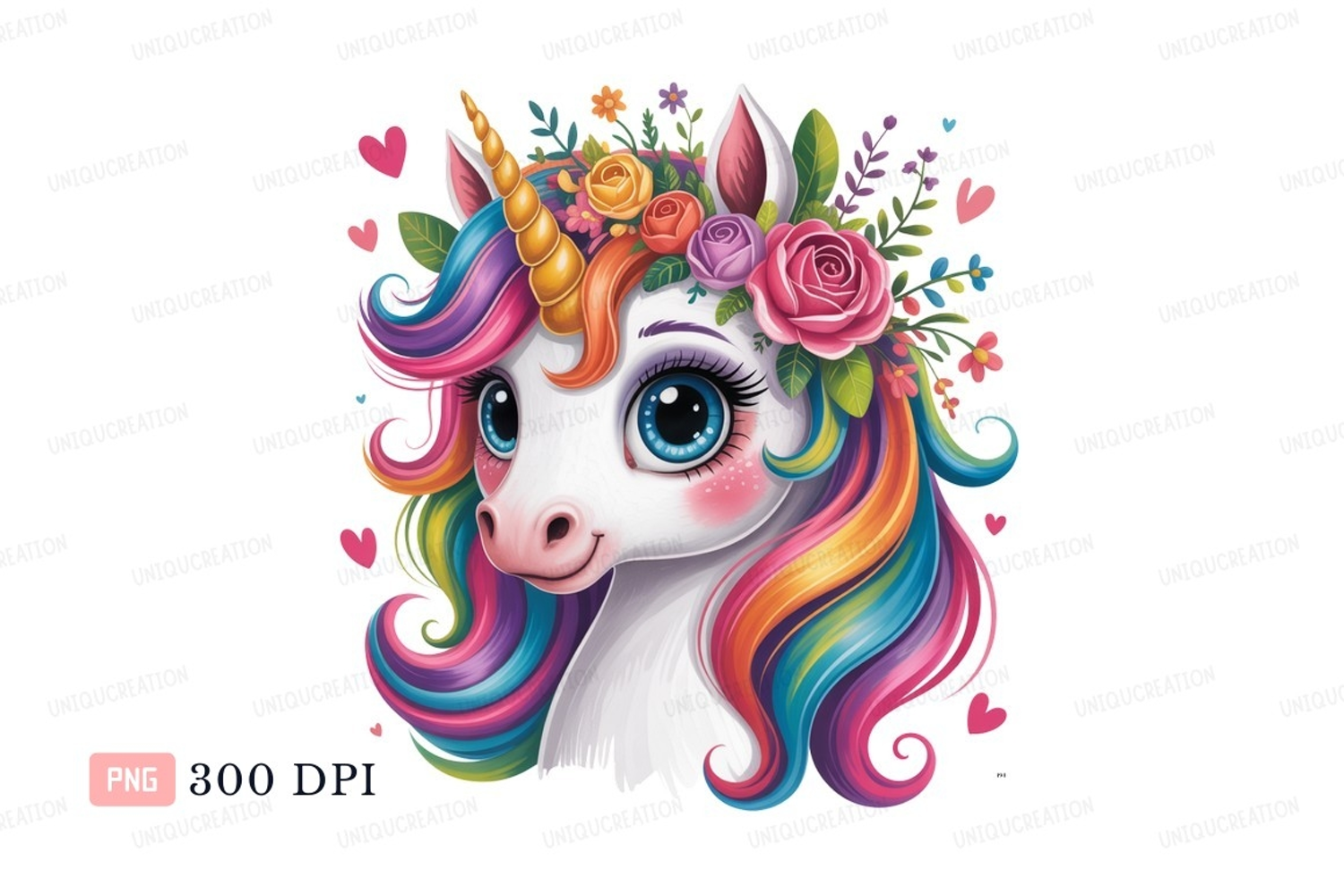 Rainbow unicorn with floral crown and hearts mane horn
