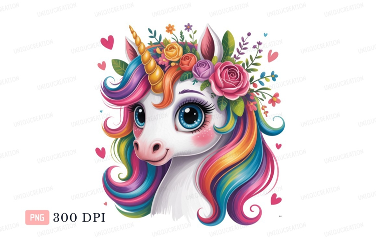 Rainbow unicorn with floral crown and hearts mane horn example image 1