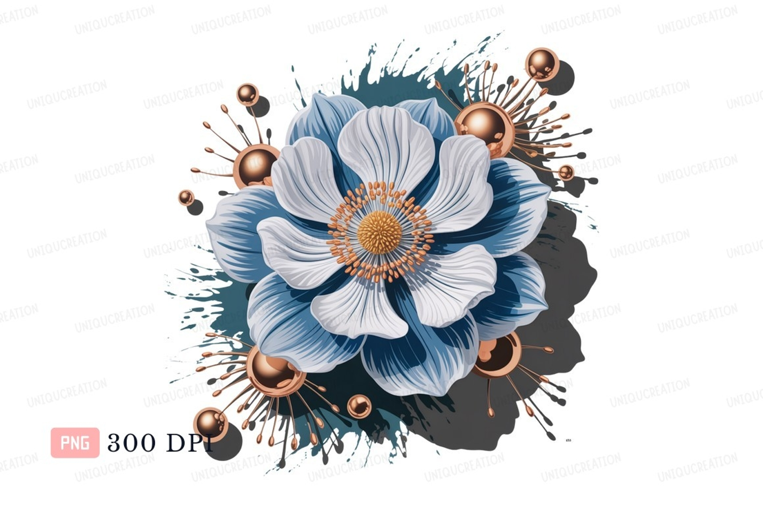 Decorative Gold Flower Ornate Abstract Botanical Blue White Petals Center