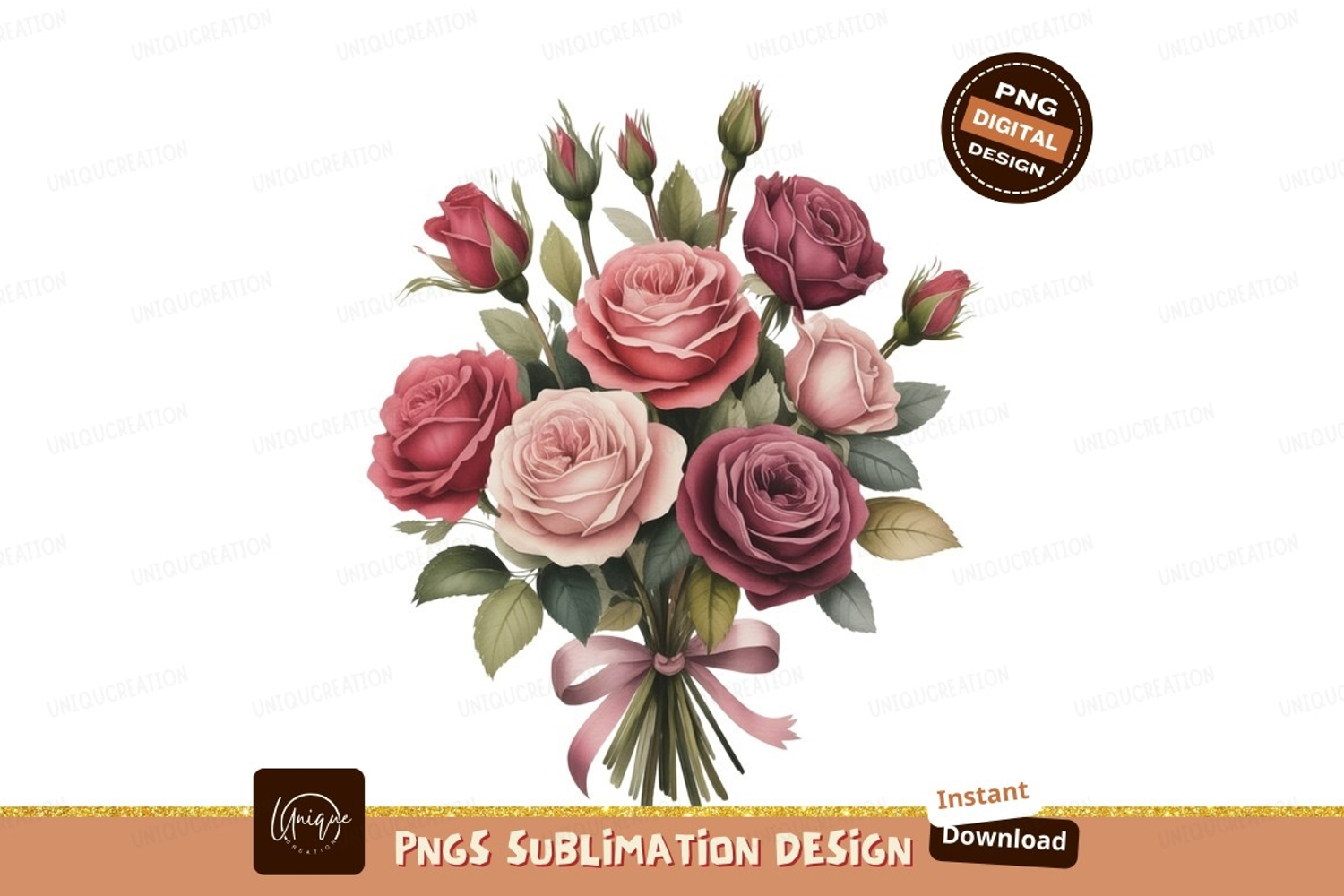 Pink and red roses bouquet with ribbon burgundy green example image 1
