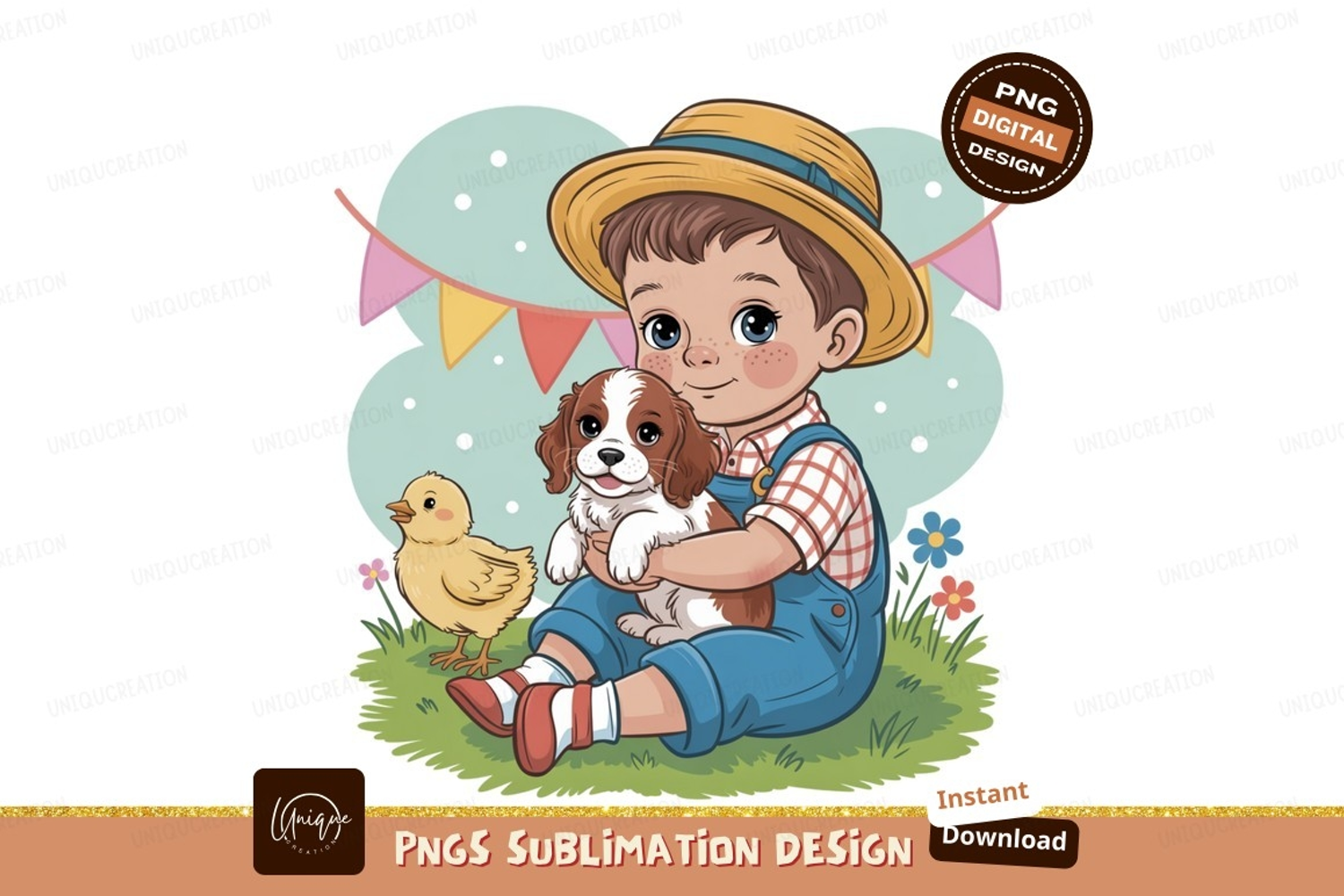 Similar Design Products to Boy holding puppy with chick and flowers grass