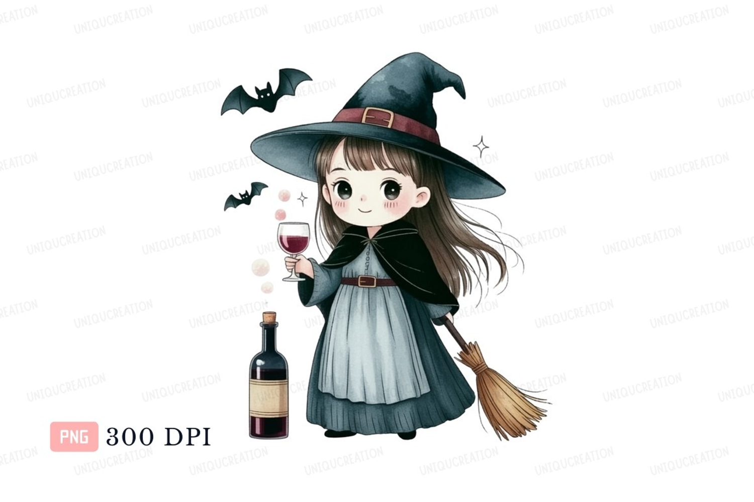 Fantasy Halloween Cute Girl Wine Magic Witch Broom Bottle Bats