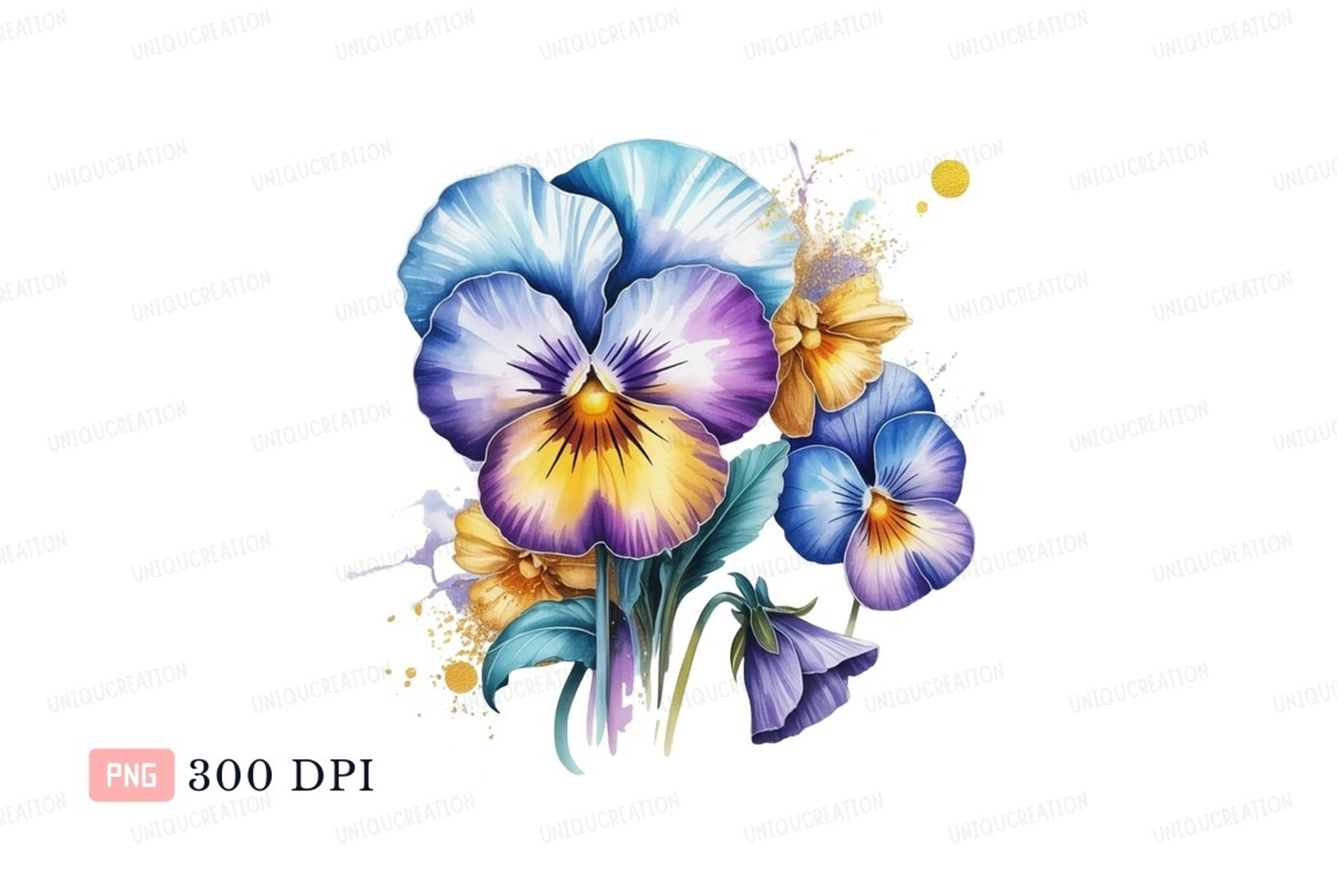 Watercolor Gold Nature Floral Flowers Splash Purple Blue Yellow Pansies