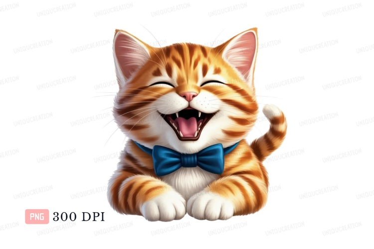 Happy Orange Blue Bow Cat Tie Kitten Joyful Laughing Tabby