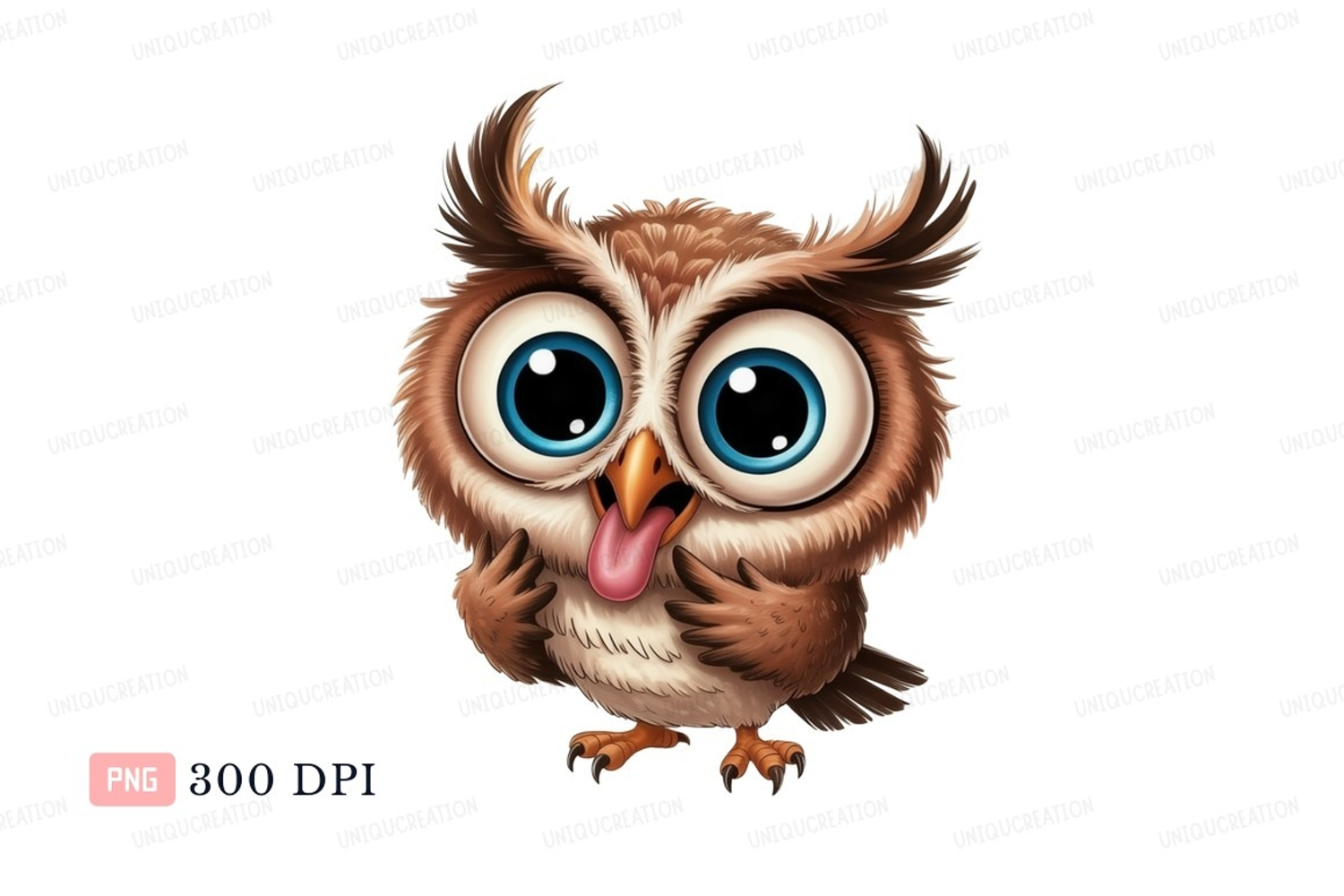 Cartoon owl with big blue eyes and pink tongue bird example image 1