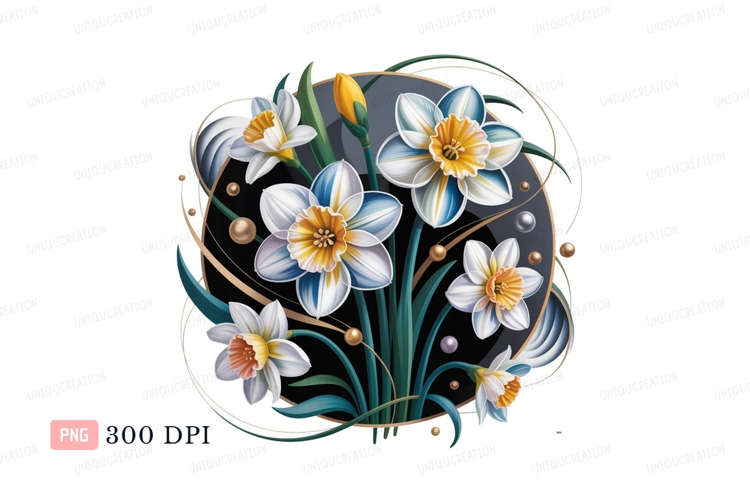 Green Floral Flowers Leaves Blue Yellow Bud White Daffodils Pearls