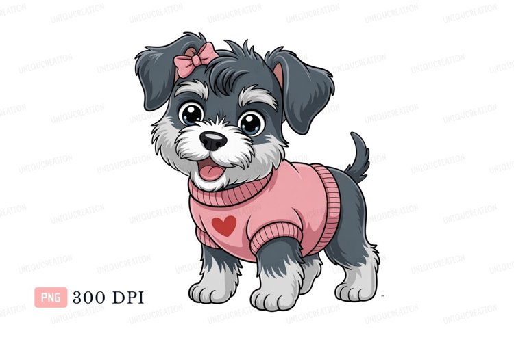 Adorable gray puppy wearing pink sweater white