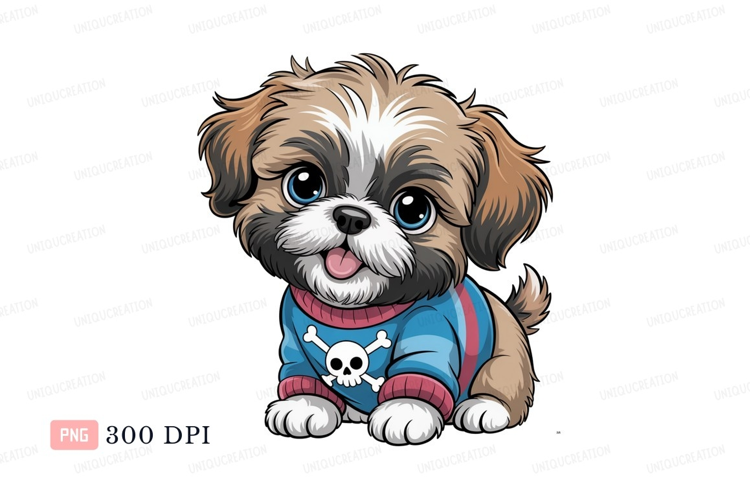 Fluffy puppy wearing skull sweater animal cartoon example image 1