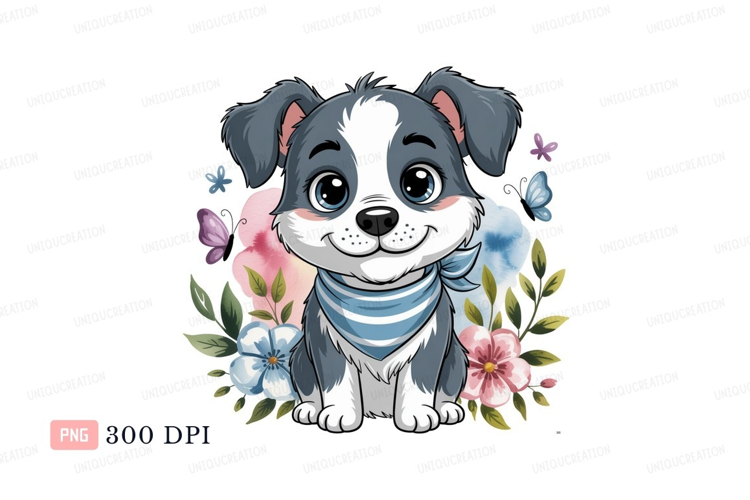 Cute puppy with flowers and butterflies cartoon animal example image 1