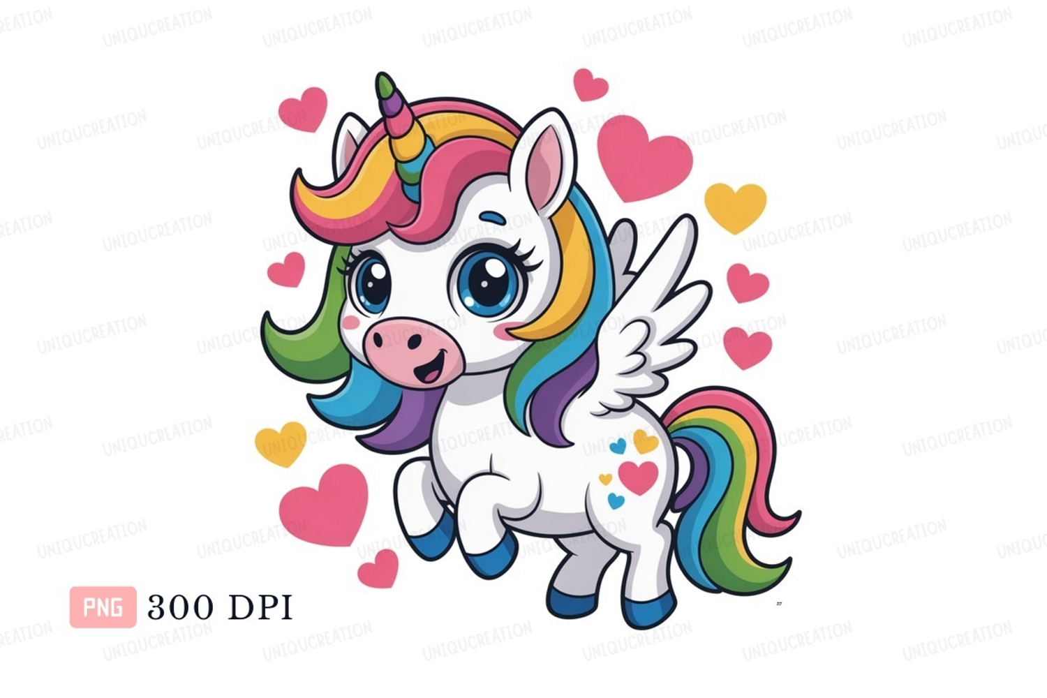 Cute unicorn with rainbow mane and wings hearts example image 1