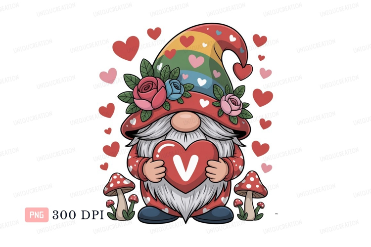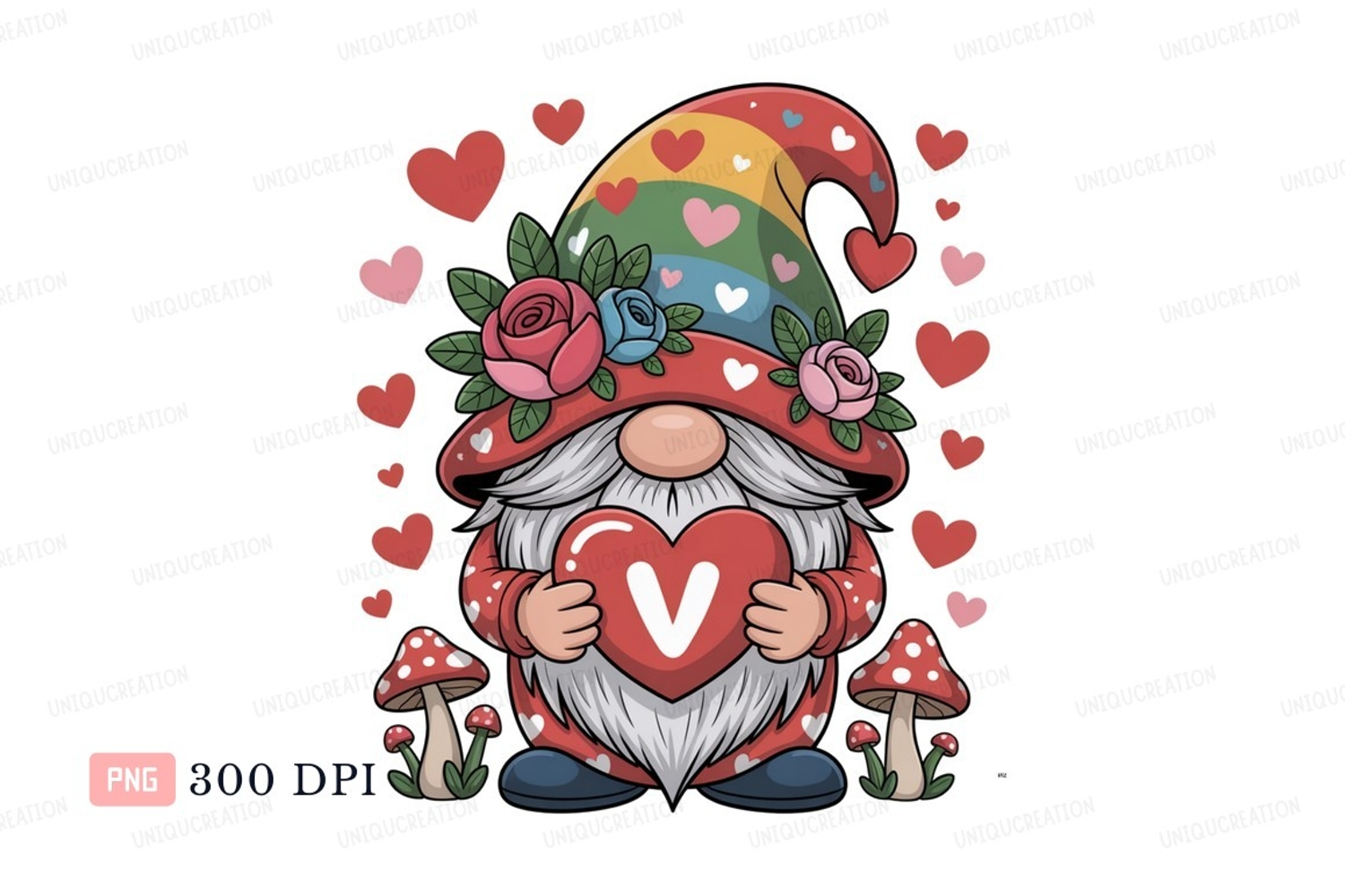 Gnome holding heart surrounded by hearts and mushrooms example image 1