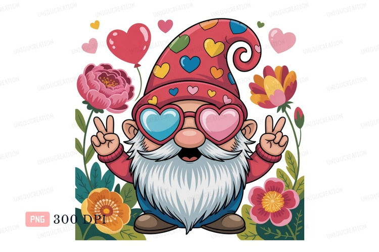 Cheerful gnome with heart glasses and flowers balloon example image 1