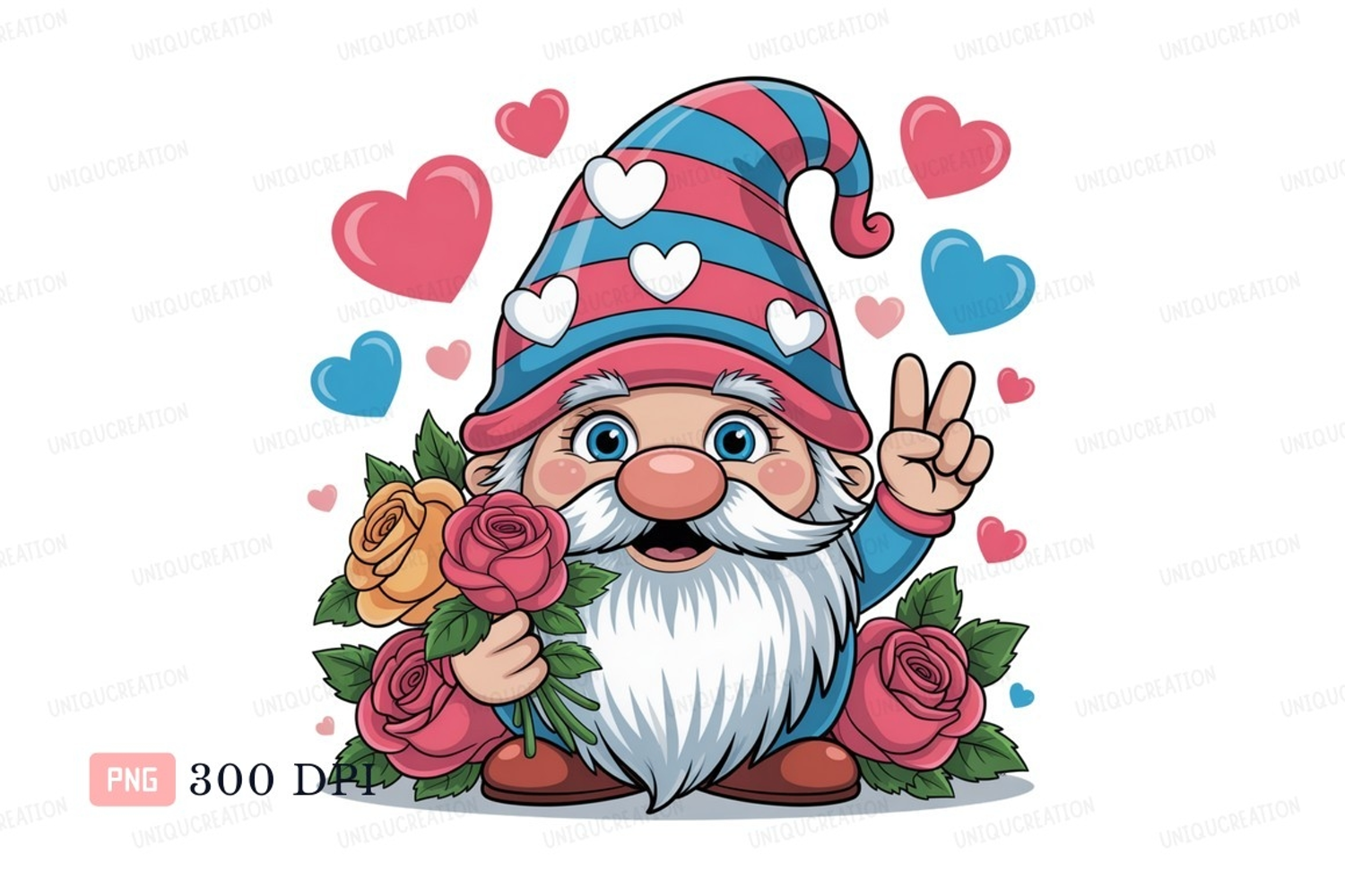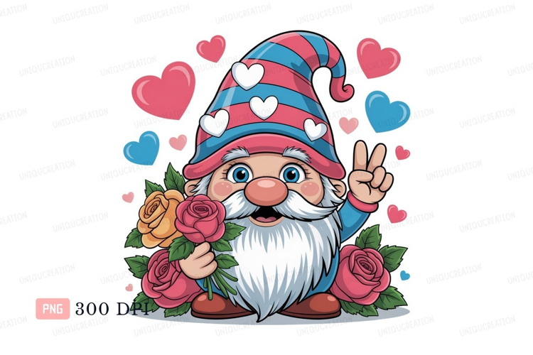 Cheerful gnome holding roses peace sign hearts example image 1