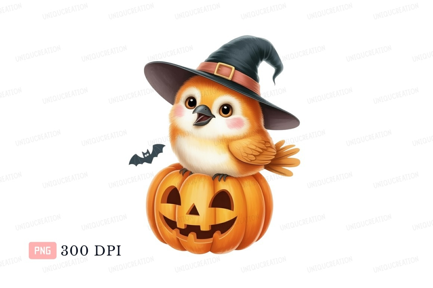 Cute bird wearing witch hat sitting on jack o lantern example image 1