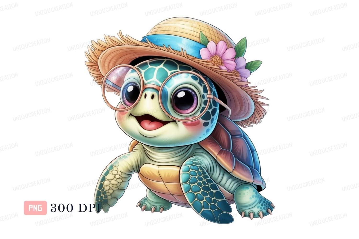 Cute turtle wearing straw hat and glasses cartoon animal example image 1