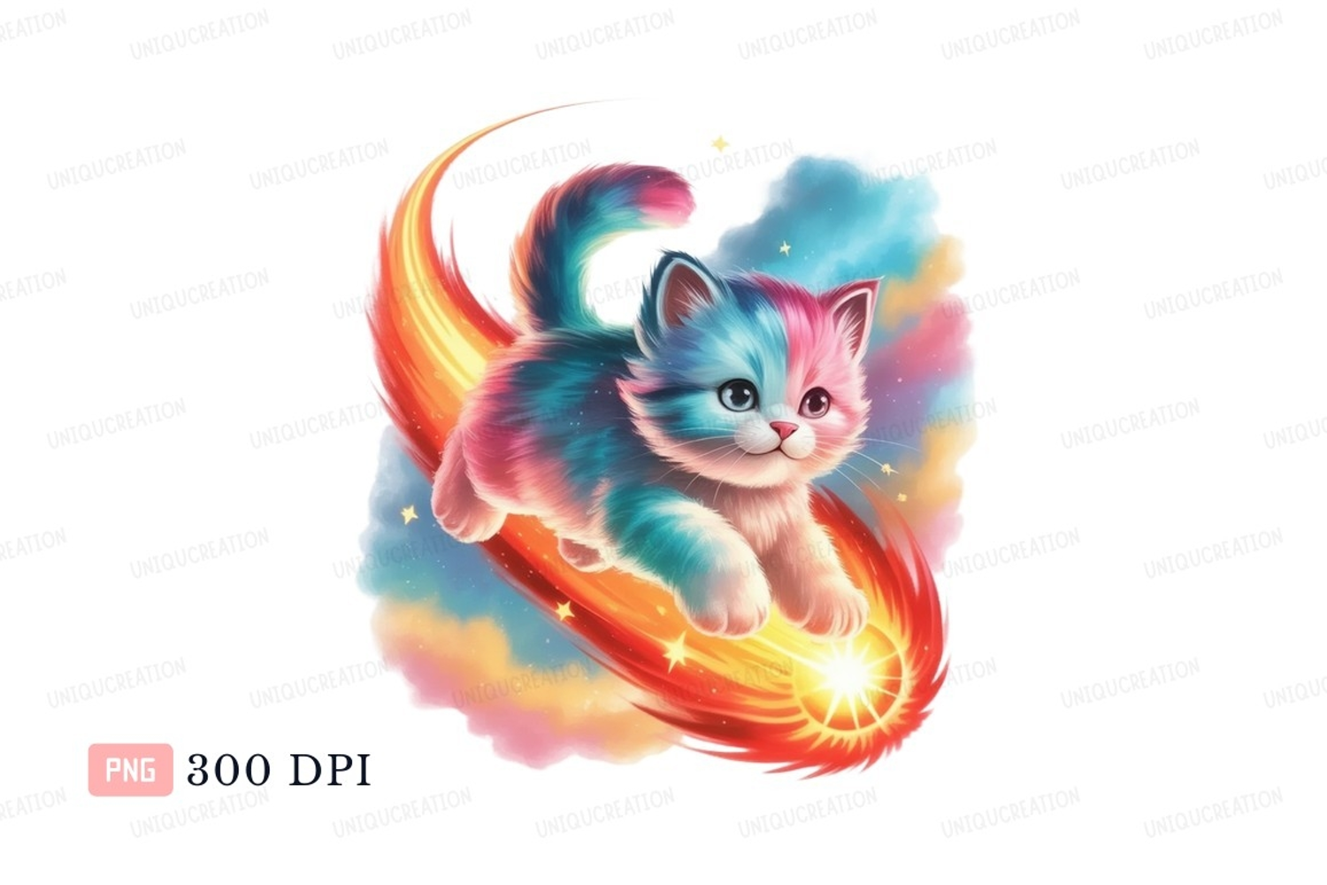 Colorful kitten riding comet space stars example image 1