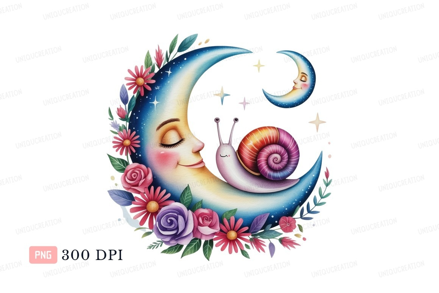 Similar Design Products to Smiling moon with snail and flowers stars night