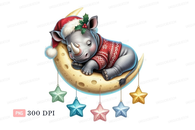 Baby rhino sleeping on moon wearing Christmas hat image example image 1