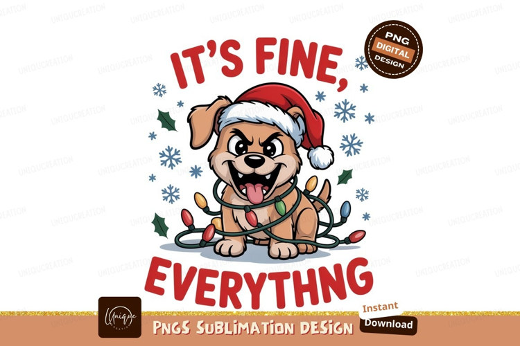 Grinning dog wearing santa hat tangled in christmas lights example image 1
