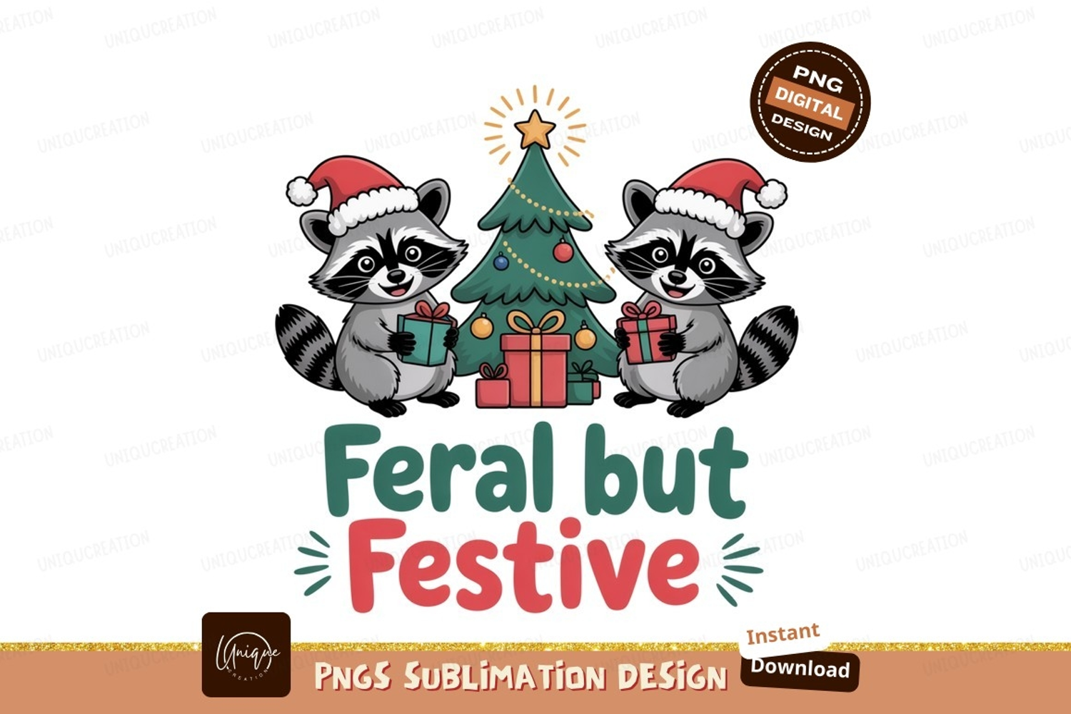 Raccoons wearing santa hats holding gifts near christmas tre
