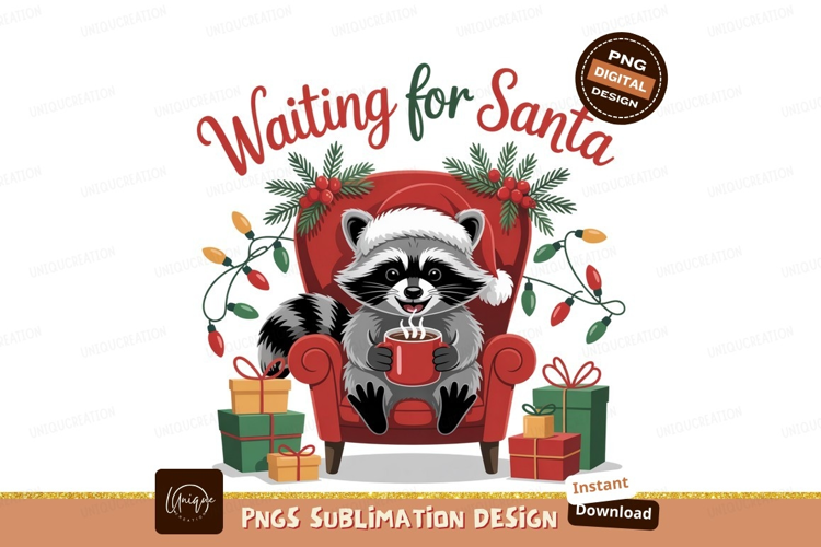 Raccoon wearing Santa hat drinking hot cocoa image example image 1