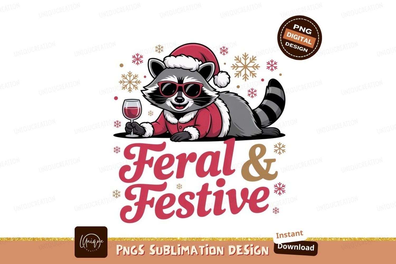 Raccoon wearing santa hat and sunglasses holding wine glass example image 1