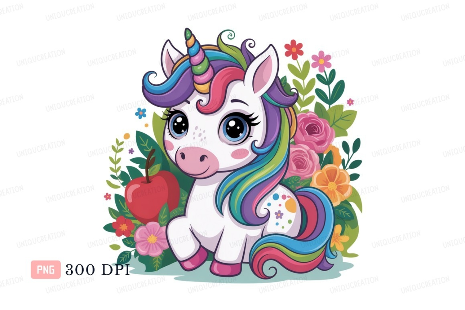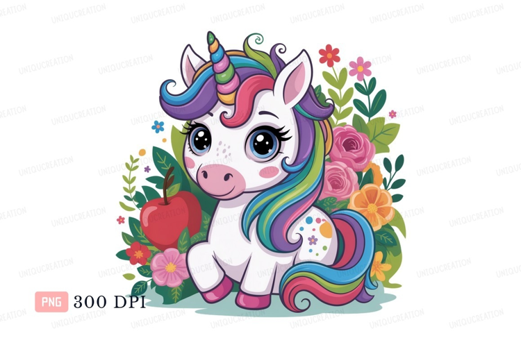 Cute unicorn surrounded by flowers and apple rainbow example image 1