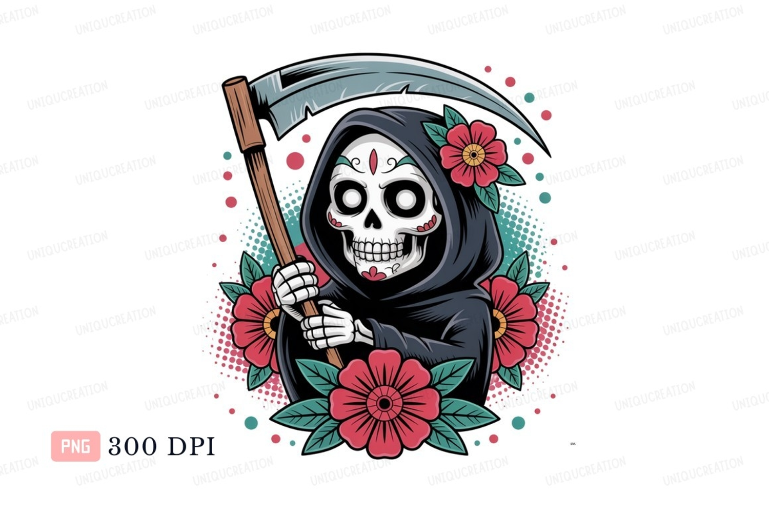Cartoon Black Green Skull Flowers Death White Red Grim Reaper