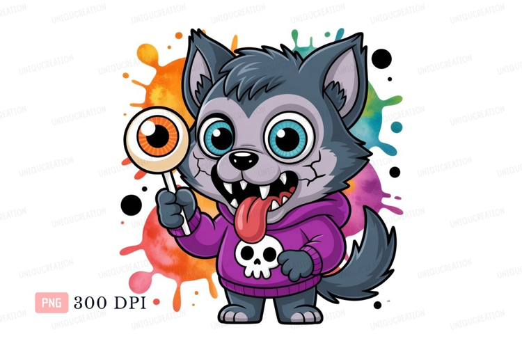 Cute wolf holding eyeball lollipop cartoon halloween example image 1