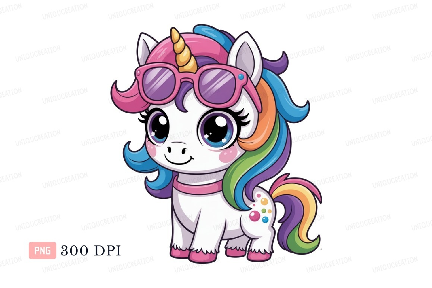 Cute unicorn with colorful mane and sunglasses tail