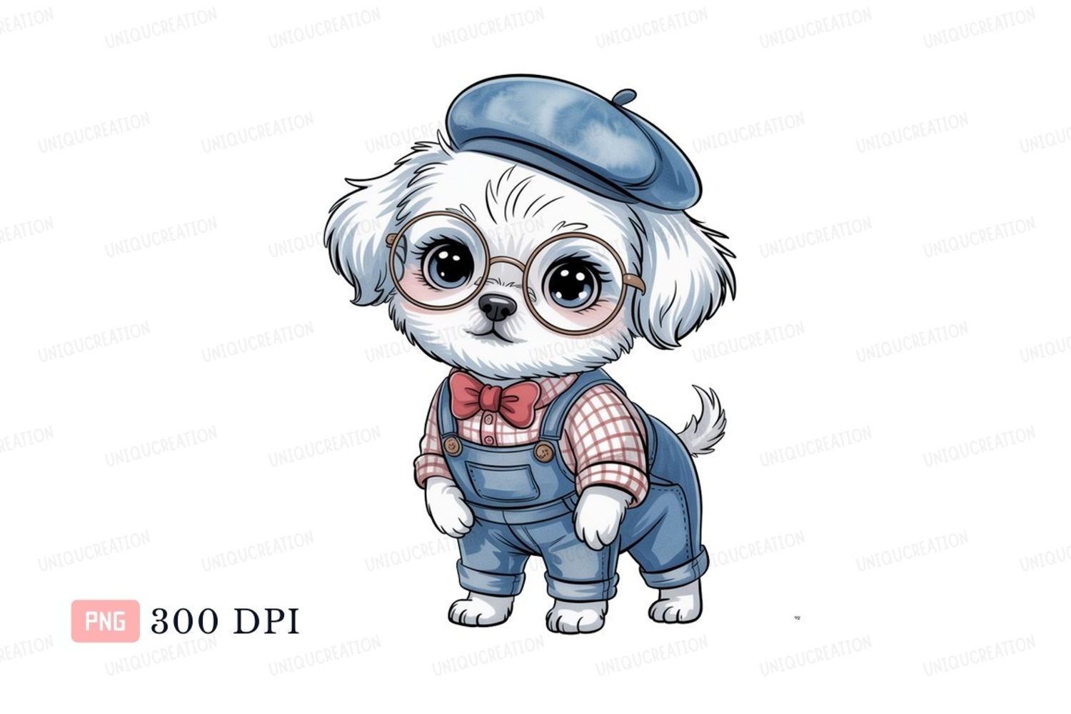 Similar Design Products to Adorable white dog wearing overalls and beret puppy