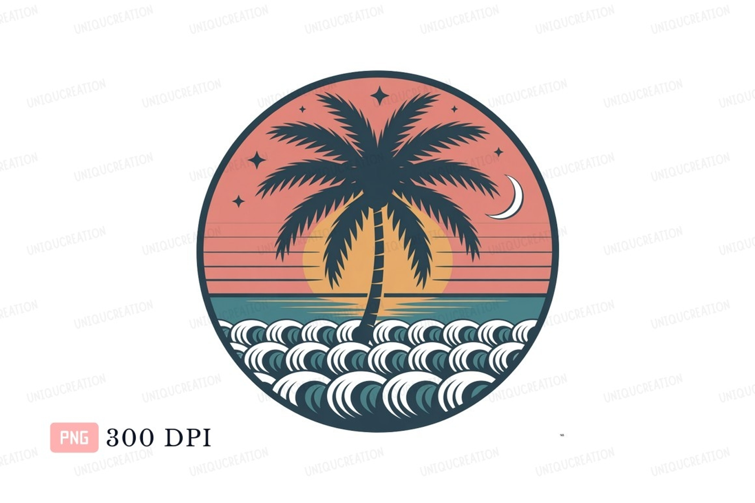 Tropical palm tree ocean sunset crescent moon waves